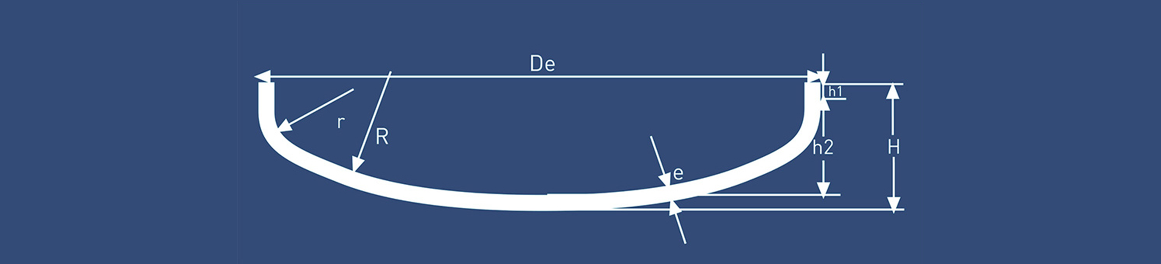 De:外徑e:投料厚度R:封頭半徑r:轉角半徑H:總高度h1:直邊高度h2:外曲面高度